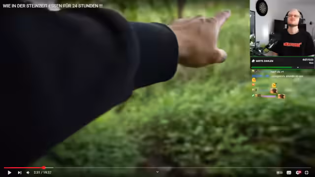 03:54:21Die Streamer begeben sich in den Wald, um natürliche Nahrungsmittel zu sammeln. Sie finden Honig, Beeren, Pilze, Haselnüsse und Walnüsse. Nach anfänglicher Ungewissheit bei der Pilzbestimmung wird der Fokus auf die Nuss-Suche gelegt. Die Teilnehmer sind von der Vielfalt an freien Nahrungsmitteln begeistert und genießen die unverarbeiteten Nüsse direkt, während sie sich in eine Steinzeit-Erlebnis hineinversetzen.