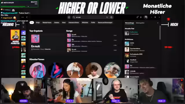 05:42:48Das Quiz wechselt zu einer neuen Kategorie, in der die Teilnehmer geschätzte Zuschauerzahlen von Streamern einordnen müssen. Sie erhalten Vorgaben wie 5000 Subs und müssen entscheiden, ob ein Streamer höher oder niedriger liegt als ein anderer. Der Streamer interagiert stark mit dem Chat, kommentiert die Schätzungen und nutzt eine Metapher vom 'Waschbär', der im Müll wühlt, um Teilnehmer zu beschreiben, die von den Fehlern anderer profitieren.