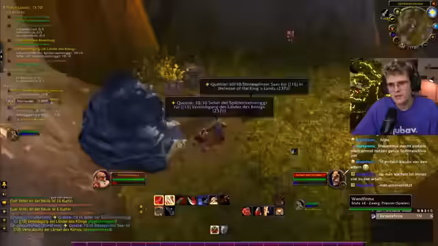 04:21:31In World of Warcraft wird intensiv mit Zuschauern kooperiert, um herausfordernde Gegnergruppen zu besiegen. Diskussionen über Strategien dominieren, etwa das Aufteilen von Gegnern und das Timing von Heilungen. Erfolgreiche Kämpfe werden gefeiert, obwohl gelegentliche Todesfälle vorkommen. Die gemeinsame Quest-Bewältigung wird als besonders spaßig beschrieben, und es wird betont, wie lohnend die Zusammenarbeit mit der Community ist.
