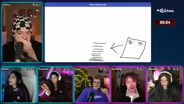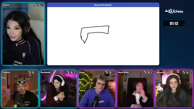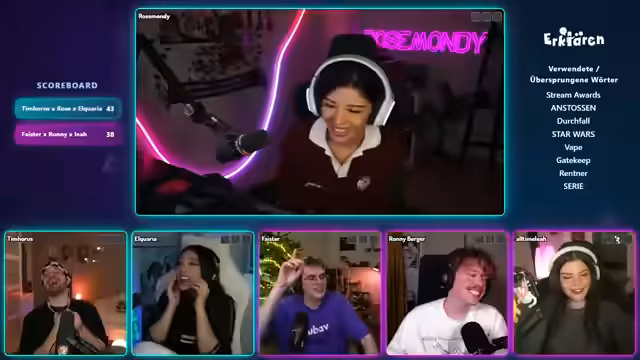 05:31:35Das Spiel wird mit weiteren Runden fortgesetzt, bei denen die Teilnehmer zwischen Pantomime, Zeichnen und Erklären wechseln. Rose und Sam übernehmen nächste Runden mit Begriffen wie 'Schiffe versenken' und 'League of Legends', während die Teams versuchen, den Punktestand auszugleichen. Die Stimmung bleibt enthusiastisch, wobei die Schwierigkeit der Begriffe und die kreative Darbietung der Teilnehmer diskutiert werden. Es wird auf die verbleibenden Spielrunden hingewiesen, um den Punktestand weiter zu verbessern.