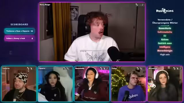 05:22:08Ronny führt Pantomime auf mit Begriffen wie 'Cowboy', 'Boxhose', 'DJ' und 'Kotzen'. Das Team errät viele Begriffe korrekt, auch wenn einige Herausforderungen wie 'Gehirnwäsche' geskippt werden müssen. Ronny erzielt insgesamt 24 Punkte, was als starkes Ergebnis gefeiert wird. Die Runde zeigt die unterhaltsame Pantomime-Performance und die erfolgreiche Teamkommunikation bei schnellen Raten.