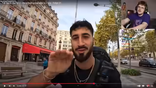 02:35:41Der Streamer äußert seine Kritik an bestimmten Regeln von 'The Race' und stellt sich die Frage, ob das Verkaufen von Ausrüstungsgegenständen auf einem Flohmarkt respektlos sei. Währenddessen versucht er mit den Zuschauern gemeinsam an dem Rätsel 'Wie viele Pferde gibt es am Arc de Triomphe?' zu knobeln, während ein Teilnehmer sich durch Paris auf die Suche nach den nächsten Kontaktpersonen macht.