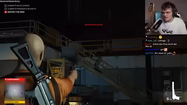 03:00:14Der Streamer verkleidet sich als Gärtner und fragt sich, ob die Arbeiter Bösewichte sind. Er findet eine Kiste und entsorgt eine Axt. Er erinnert sich an Hitman-Speedruns mit Revi, bei denen die Ziele schnell ausgeschaltet werden. Er entdeckt einen Typ und will ihn töten, um seine Kleidung anzuziehen. Er wirft eine Münze, um ihn abzulenken, will aber nicht immer die gleiche Taktik anwenden. Er versucht, ihn zu töten, aber seine Cam überhitzt. Er speichert und überwältigt eine Putzkraft, um sich als diese zu verkleiden. Er bewegt sich nun frei in dem Bereich und will die Ziele ausschalten. Er überlegt, ob er sich als Wache verkleiden soll. Er entdeckt Caruso und überlegt, ihn runterzuwerfen. Er tötet ihn und einen weiteren Mann. Er wird als Psychopath bezeichnet. Er entdeckt Münzen und will jemanden mit einem Stromschlag töten. Er verkleidet sich als Wache und muss nun den Virus zerstören.