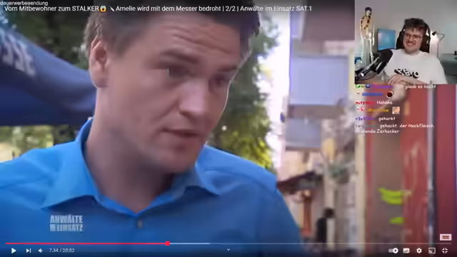 00:12:30Nachdem der Streamer sich neue Videos für den Stream angeschaut hat, entscheidet er sich dafür, die YouTube-Serie "Anwälte im Einsatz" zu zeigen. Der speziell ausgewählte Fall dreht sich um eine Frau namens Amelie, die nach ihrer Rückkehr aus London feststellt, dass ihr Untermieter Sascha trotz Absprache nicht ausgezogen ist und nun in ihrer Wohnung lebt.