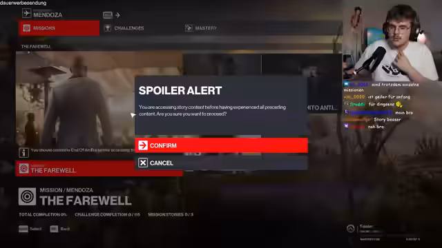 02:37:49Der Streamer startet das Spiel und stellt fest, dass er keine Ahnung von der Steuerung hat. Er wählt den Casual-Schwierigkeitsgrad und will das Spiel unauffällig durchspielen. Er blendet die Steuerung ein und checkt seine Ausrüstung. Er entdeckt, dass er sich als Koch verkleiden muss und erledigt dies, indem er einen schlafenden Mann überwältigt und seine Kleidung anzieht. Als Koch getarnt, will er sich zu seinem neuen Arbeitgeber begeben, vermeidet aber den Haupteingang, um nicht durchsucht zu werden. Er trifft sich mit dem Küchenchef und erfährt, dass er eine Waffe in der Mülltonne verstecken soll. Stattdessen entscheidet er sich, über das Dach einzusteigen. Er findet eine abgelaufene Dose Spaghetti-Sauce und betritt das Gebäude. Dort trifft er auf seinen neuen Kollegen und gibt vor, sich einzuarbeiten. Er identifiziert seine beiden Ziele und plant, den Küchenchef zu vergiften, indem er ihm die abgelaufene Spaghetti-Sauce gibt.