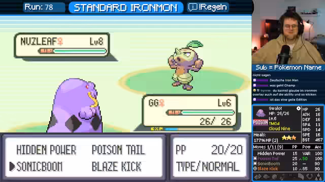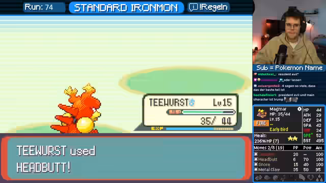 00:08:02Der Streamer startet das Ironmon-Spiel und fängt ein Miltank mit 490er BST. Er ist über dessen Moveset (Thunder Punch, Psywave) und Geschwindigkeit unzufrieden, kann es aber als potentielles Viewer-Pokémon nutzen. Nachdem der Run scheitert, resettet er und fängt ein Relaxo, das das Potenzial für einen starken Run hat. Das Pokémon hat jedoch nur geringe Werte und ein nicht passendes Moveset, weshalb der Streamer den Lauf erneut abbricht. Daraufhin fängt er ein Magmar, das schnell und stark ist, aber ebenfalls kein ideales Moveset besitzt.