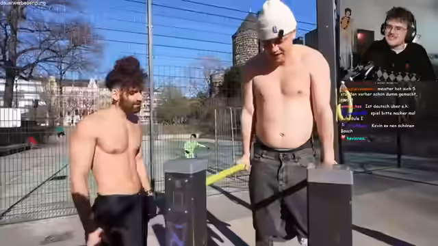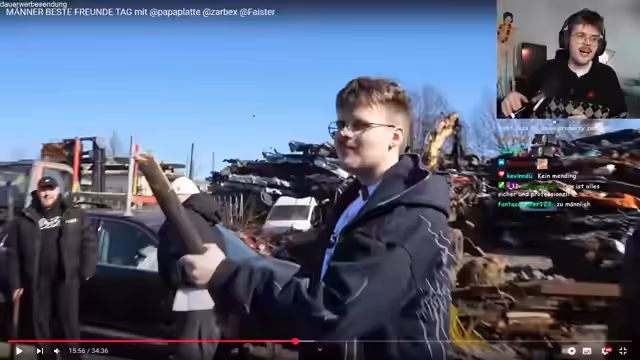 01:04:10Nach dem BBQ treten mehrere Pannen auf. Die geplante PS-Offroad-Tour muss abgesagt werden, da die Gruppe zur falschen Adresse fährt. Auch alternative Aktivitäten wie Axtwerfen und Angeln scheitern. Daraufhin landet die Gruppe auf einem Schrottplatz, wo sie alte Autos auseinandernehmen. Der Streamer beschreibt diese Aktivität als kathartisch und therapeutisch, besonders für Mike. Der Abschluss des Tages war eine spontane Sporteinheit, wobei die Teilnehmer durch eine motivierende Trainerin zu Extremsport animiert wurden.