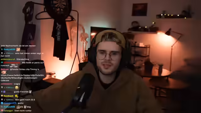 22:26:03Der Streamer denkt über seine zukünftige Streaming-Karriere nach und könnte sich vorstellen, auch in 10 Jahren noch zu streamen, wenn er nicht 'unschillig' wird. Er diskutiert mit Chat, wer aus seinem Umfeld möglicherweise zu Kick wechseln würde. Es folgt eine tiefe persönliche Reflexion über seinen Lebensstil, Konsumverhalten und finanzielle Ausgaben, wie ein Auto, das hauptsächlich für die Freundin genutzt wird, und Essen, das er selten bestellt.