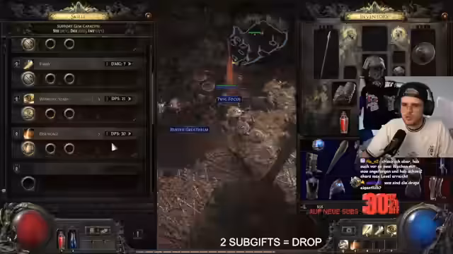 01:59:25Nach erreichen von Level 5 wird der Fokus auf die Anpassung der Fähigkeiten gelegt. Es werden Support-Gems auf Basis von Websites genutzt, um Skills wie Lightning Spear zu verbessern, welche den Schaden steigern. Das Inventar-Management wird als nervig eingestuft. Die Spieler erkunden die Story nur oberflächlich. Die Chancen für Twitch Drops werden thematisiert. Es wird der Wunsch geäußert, nicht nur am Stream zu spielen, auch private Spielzeit ist vorgesehen.