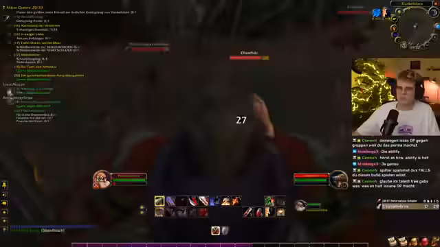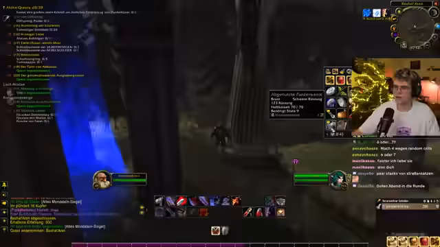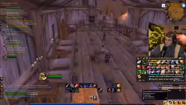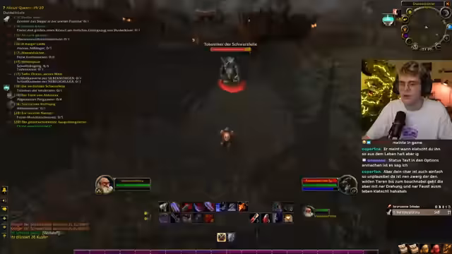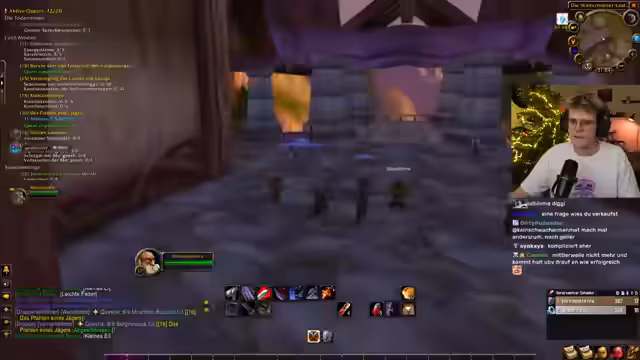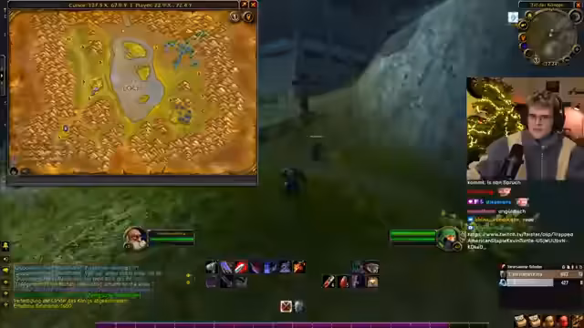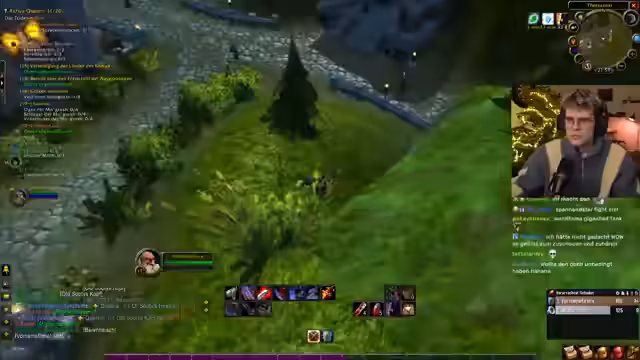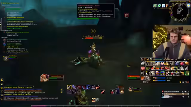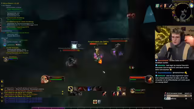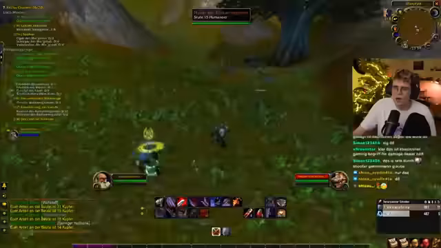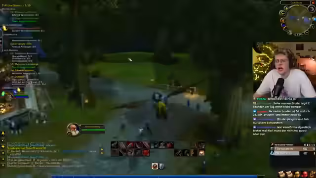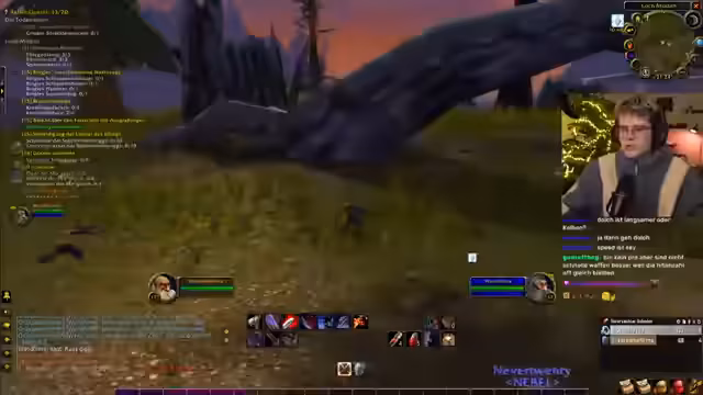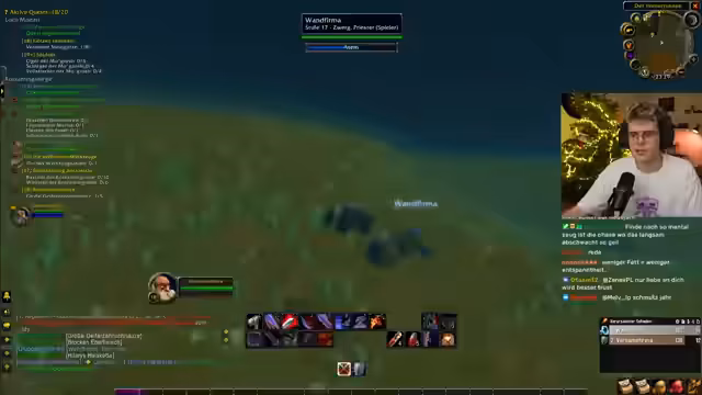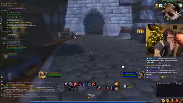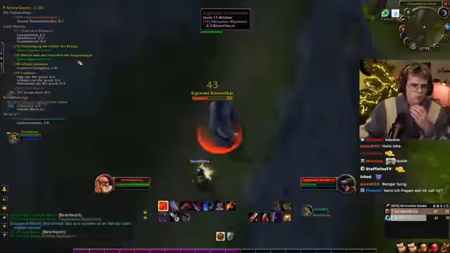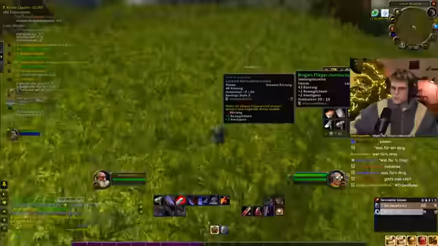03:08:49Der Streamer spielt World of Warcraft mit einem Team (u.a. Rete und Sarah), levelt Charaktere und diskutiert Gameplay-Strategien. Themen sind Addons, Waffenvergleiche (Dolch vs. Kolben) und Schadensberechnungen. Ein neuer Spieler namens Ronny tritt dem Stream bei, und es folgen humorvolle Debatten über 'Ick-Kings' (unattraktive Hobbys/Benehmen). Technische Aspekte wie Talentverteilung und Berufsauswahl (Priester) werden besprochen, während sie gemeinsam Quests erledigen und Gebiete erkunden.