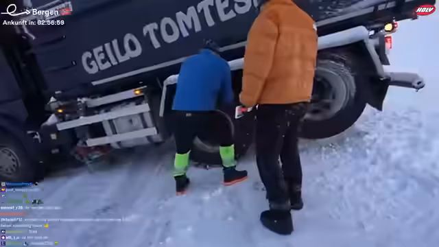 06:18:13Die Gruppe nimmt weiterhin Geräusche von den Schneeketten wahr und diskutiert, ob diese normal sind oder auf ein Problem hindeuten. Einige Zuschauer im Chat empfehlen, die Ketten abzunehmen, da die Straße nicht mehr glatt ist. Es wird jedoch befürchtet, dass die Straße in wenigen Kilometern wieder glatt werden könnte. Die Gruppe ist hin- und hergerissen zwischen dem Wunsch, die störenden Geräusche zu beseitigen und der Sorge, ohne Ketten auf Glatteis zu geraten. Es wird die Möglichkeit eines Reifenschadens durch die Ketten in Betracht gezogen, aber auch argumentiert, dass die Ketten im Falle eines Falles die Reifen schützen würden. Letztendlich wird beschlossen, die Ketten vorerst drauf zu lassen, da die Straße teilweise noch glatt ist und ein plötzlicher Wetterumschwung nicht ausgeschlossen werden kann. Die Gruppe fährt langsam weiter und beobachtet die Ketten genau, um sicherzustellen, dass sie keine größeren Schäden verursachen.