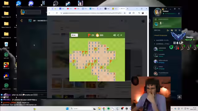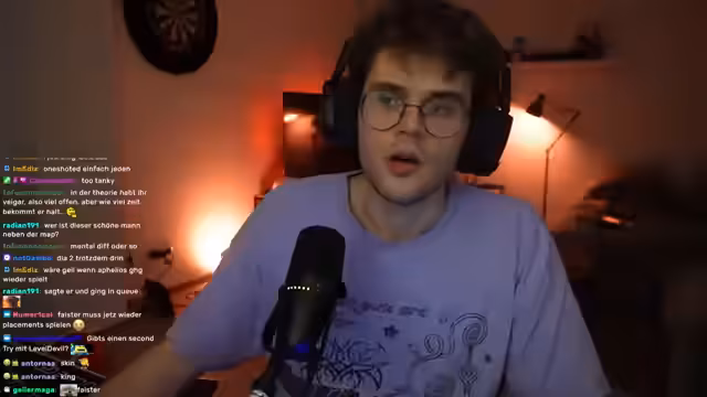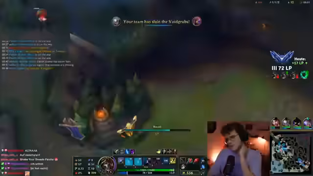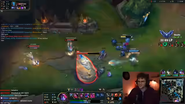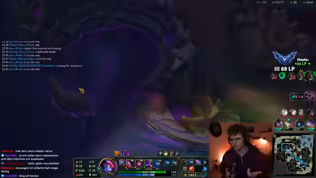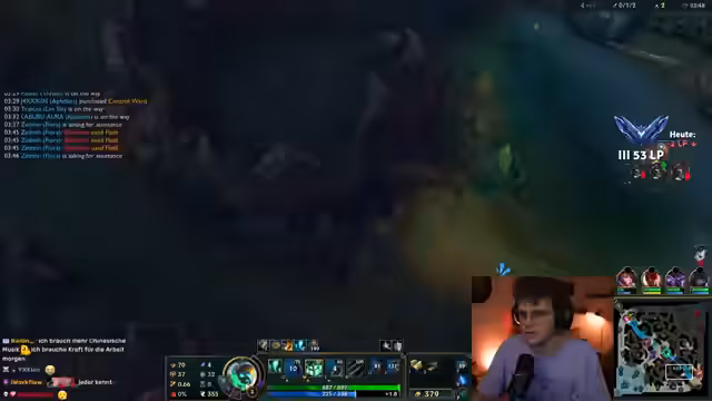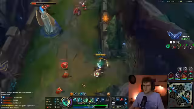 02:30:12Die Stimmung im Stream schwankt zwischen triumphalen Spielphasen und starker Frustration. Nach einem erfolgreichen Fight werden hochgelobte Plays gefeiert, doch direkt darauf werden impulsive und taktische Fehler kritisiert, die zum Verlust des Spiels führen. Ebenso wird die Meta besprochen, wie die Stärke von Blue Cain oder Aphelios Thresh. Diese Themen werden oft mit privaten Anspielungen gemischt, wie der Nennung von 'Capri-Sonne Zero' oder die Diskussion von Horrorgames, was das Geschehen unterbricht und für Abwechslung sorgt.