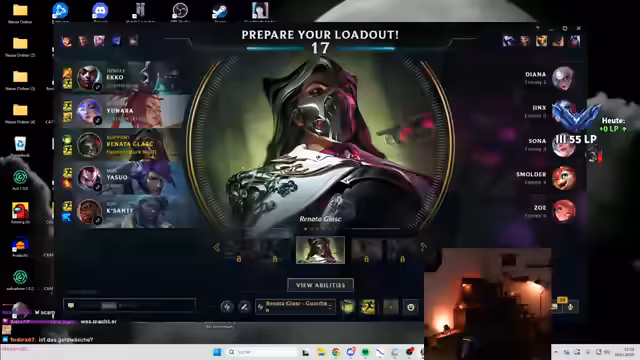 00:05:55Der Stream beginnt mit einem dynamischen Willkommen an die Zuschauer. Der Streamer verkündet sein klares Ziel: Den Rang Diamond 1 in League of Legends zu erreichen und seinen persönlichen Peak zu brechen. Er gibt einen Einblick in seinen bisherigen Tag, der durchgezeichnete Spielesessions in League of Legends, Rocket League, späterem Einkauf und einer längeren Nachtruhe geprägt war. Um seine Wachheit zu gewährleisten, hat er einen Kaffee zu sich genommen und ist hochmotiviert, eine lange Session mit bis zu acht Stunden Duo-Botlane-Action zu absolvieren.