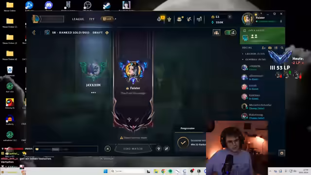 02:45:03Die Kommunikation und die Stimmung im Team werden immer wichtiger. Ein gegnerischer Spieler, der aus dem TeamSpeak verschwindet und nur noch über den League-Chat erreichbar ist, sorgt für Chaos. Auch ist von mehreren FF-Votes (Surrender) die Rede, was auf eine angespannte Spielsituation und mangelnden Teamgeist hindeutet. Der Streamer selbst verliert in Phasen mehrfach das Leben ohne ersichtlichen Grund, was ihn ärgert. Trotzdem bleibt der Fokus darauf, die Spiele zu gewinnen und den Rang zu verbessern, trotz technischer und taktischer Hindernisse.