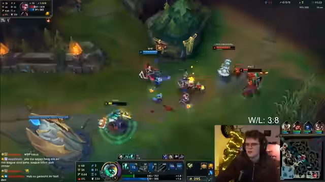 02:57:55Ein verpasnter Kill durch den gegnerischen ADC, der nur eine E wirfen brauchte, führt zu großer Wut. Der Streamer fühlt sich von seinem eigenen ADC im Stich gelassen, da keine ausreichende Kill Pressure aufgebaut wurde. Er kritisiert die Teamkommunikation und -entscheidungen scharf und beklagt, dass gute Positionierungen und Fähigkeiten nicht in erfolgreiche Aktionen umgemünzt werden. Das Gefühl, die einzige aktive Kraft im Team zu sein, verstärkt die Frustration über die anhaltende Niederlagenserie.