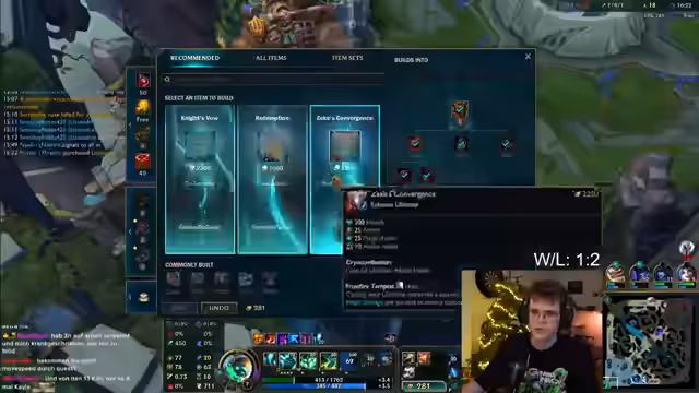 00:21:45Im Verlauf des Spiels festigt der Streamer seine Position als Tank Galio und erwähnt sein Happy Feeling, wenn er Minions für Farming bekommt. Er entwickelt einen Plan, später zu einem Specter's Skull zu greifen, um sich 'unkillable' zu machen. Nach einem geglückten Teamfight, bei dem er 'huge' Impact hat und eine Killing Spree in der Bot-Lane startet, wird er stark. Er fühlt sich mit Specter's Skull und weiteren Items wie Mercury's Treads stark genug, um aggressiv zu pushen und Druck aufzubauen, was ihm großen Spaß bereitet.