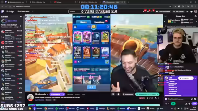 03:23:47Es beginnt mit einer humorvollen Interaktion über das Hinzufügen von Eiern zu einem Gericht, gefolgt von der Feststellung, dass zu viel Öl und Butter verwendet wurden. Danach wechselt das Thema zu Clash Royale, wobei das Publikum um Erklärungen zu bestimmten Aspekten des Spiels gebeten wird, insbesondere zum Evo-Ofen. Es wird angekündigt, dass man bald Clash Royale spielen werde, obwohl man erst vor ein paar Wochen angefangen habe. Eine kurze Erklärung des Spiels folgt, einschließlich der Karten und des Ziels, die Türme des Gegners zu zerstören. Caro stellt sich vor und erklärt, dass sie da ist, damit alle fit und gesund bleiben und das Team gewinnt. Es folgt ein kurzer, zusammenhangloser Abschnitt über einen 'Samenerguss' mit sieben Jahren und psychedelische Erfahrungen in Leipzig. Abschließend wird eine Bestellung für eine Pizza nur mit Salami aufgegeben.