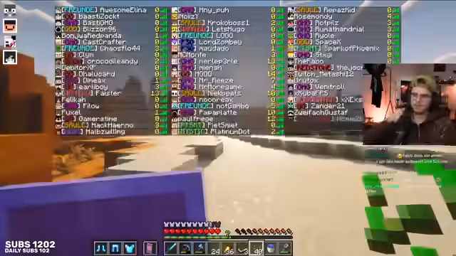 05:50:13Es wird bemerkt, dass der Deathcounter aufgrund der Ping-Anzeige nicht sichtbar ist, da es vier Zeilen gibt, was als ungewöhnlich viele Zeilen für einen Stream empfunden wird. Die Spieler sind überrascht über die hohe Anzahl von 63 Spielern auf dem Server, was der Anzahl der Whitelist-Spieler vom letzten Jahr entspricht. Es wird auch das Thema Copyright-Musik angesprochen, wobei ein Spieler angibt, ständig Copyright-Musik auf einer separaten Tonspur zu hören, was als unproblematisch dargestellt wird.