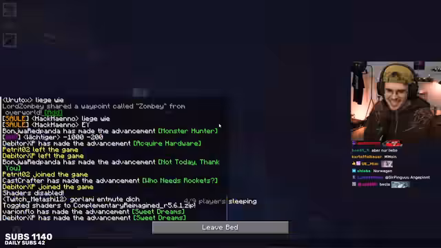 07:38:38Es wird über die Gestaltung der Basis und die Funktionalität von Farmen diskutiert. Die Frage nach dem Zeitpunkt der Basiserstellung sorgt für Verwirrung, da bereits viel Fortschritt erzielt wurde. Es wird erwähnt, dass viele Diamanten vorhanden sind, um Spitzhacken herzustellen. Ein Spieler ist durch das unfertige Dach seiner Nether-Basis blockiert. Es wird über Abstimmungen für neue Inhalte gesprochen, wobei Nether und End als mögliche Daten genannt werden. Die Effizienz von Farmen ohne Observer wird als beeindruckend empfunden, insbesondere bei einer Karottenfarm. Es wird auch über die Installation von Shadern zur Verbesserung der Grafik gesprochen, wobei Complementary Shaders als gute Option genannt werden.
