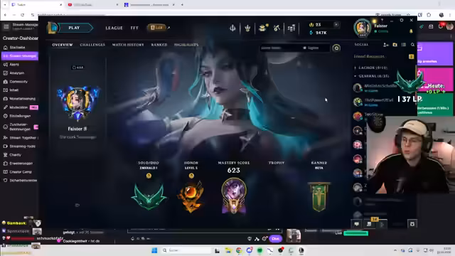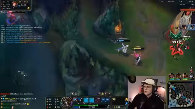 03:07:45Nachdem er den Champion Draven für die Botlane wählt, zeigt sich der Streamer motiviert und gibt an, nach Instinkten zu spielen. Dies bringt ihm Dopamin. Er formuliert klare Ziele: Er will in League of Legends Master-Rank und in Rocket League Grand-Champ erreichen. Die Motivation ist hoch, auch wenn er die aktuelle Season als nervig und schwierig empfindet.