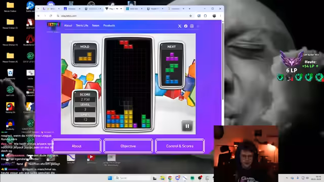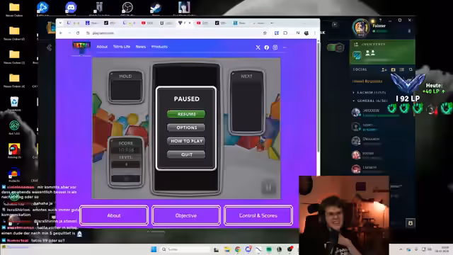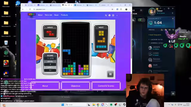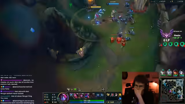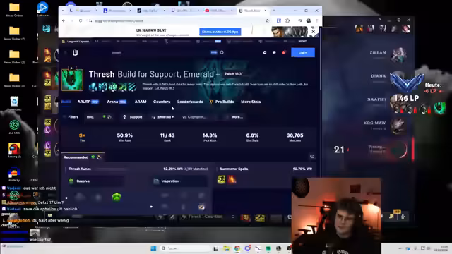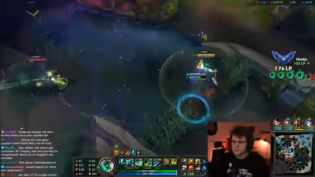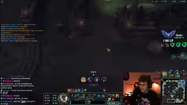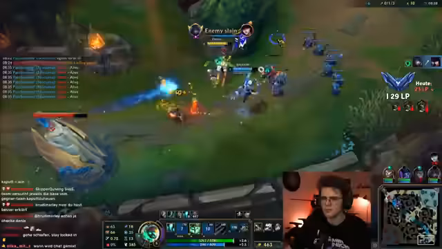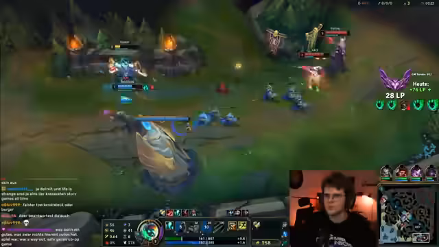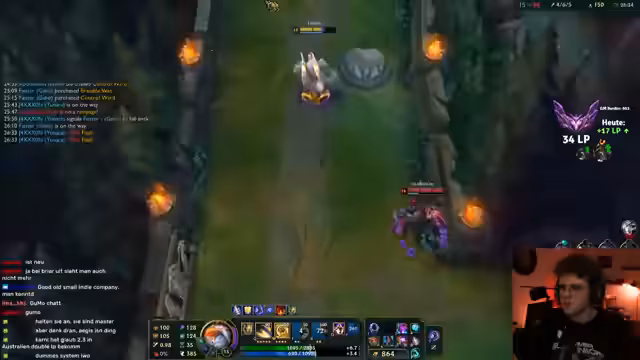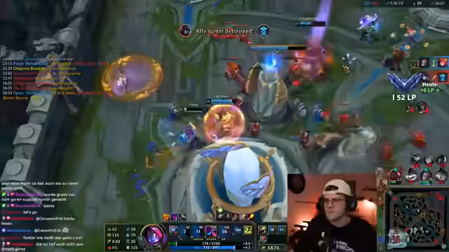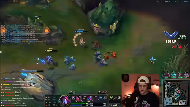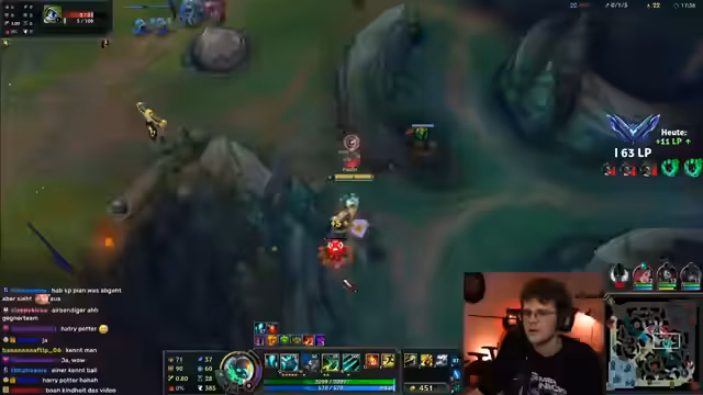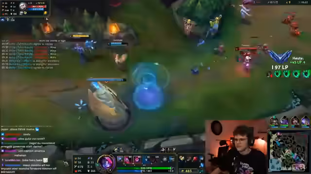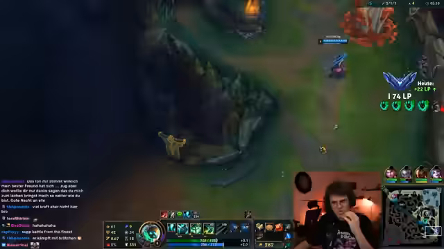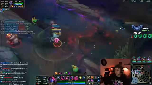 04:44:20Der Streamer kommentiert sein Ranked-Spielgeschehen. Er erreichte den Peak von Master 3LP, verlor jedoch danach vier Spiele und kämpft darum, seinen Rang zu halten. Seine Leistung ist teilweise unberechenbar; er kritisiert sowohl seine eigenen Fehlschläge als auch die Spielweise seiner Mitspieler, insbesondere eines Attack-Speed-Champions. Das ingame-Chatverhalten ist angespannt, er erwähnt Flame und sucht nach einem Weg, mental mit der Situation umzugehen.