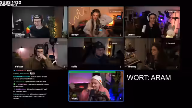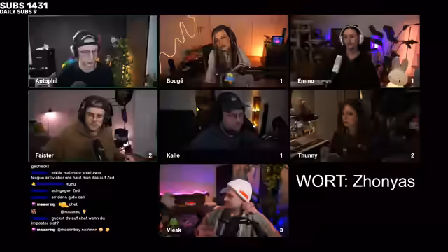 03:02:56Die allerletzte Runde des Abends beginnt, bei der versucht wird, Metagaming zu verhindern. Ein Moderator mischt sich in den Chat ein, um störende Beiträge zu stoppen und den positiven Vibe aufrechtzuerhalten. Nach einer Reihe von schwer erratenen Wörtern, die oft mehr Ecken erfordern, als man ahnt, wird der Imposter identifiziert und das finale Voting durchgeführt. Der Punktestand wird zusammengefasst. Der Streamer bewertet die vergangenen Runden als einen guten Mix aus Schwierigkeitsgraden und analysiert die Leistung der einzelnen Spieler, insbesondere die Rolle des Moderators Phil.