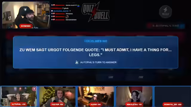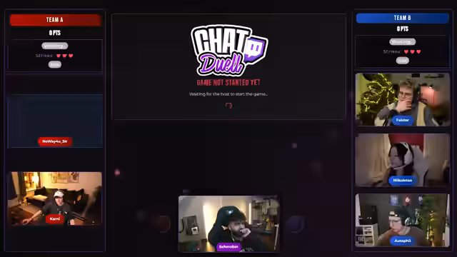 04:19:24Das Quiz wechselt in die Finalrunde mit einem neuen Teamformat, bei dem Teilnehmer nach skillbasiertem Matchmaking gegeneinander antreten. Es wird ein Chat-Duell angekündigt, bei dem Zuschauerantworten erraten werden müssen. Die Anmoderation erklärt die Regeln des Face-Off-Formats, bei dem sofortige Antworten nach dem Buzzern erforderlich sind. Die Teams diskutieren Strategien, während technische Vorbereitungen für die nächste Runde getroffen werden.