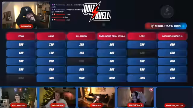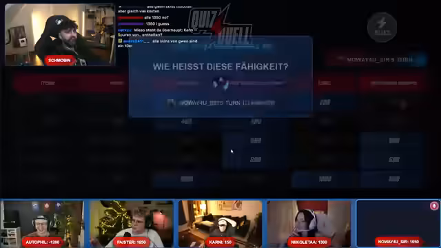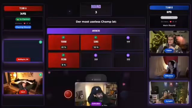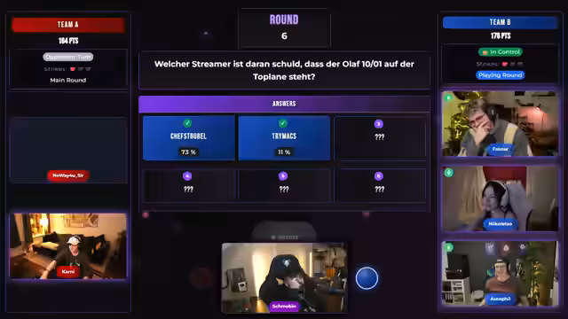 02:06:10Um die Zuschauer einzubinden, teilten die Streamer einen Abstimmungslink im Chat, über den Antwortmöglichkeiten für Quizfragen gewählt werden konnten. Trotz anfänglicher Schwierigkeiten mit virtuellen Kameras und Upload-Problemen startete das Spiel mit Kategorien wie Skin-Vergleichen. Strategische Fehler traten auf, als Teilnehmer neuere Champions unterschätzten. Die Atmosphäre blieb jedoch locker, wobei Inside-Jokes über angebliche 'Krypto-Miner' und technische Pannen für Lacher sorgten.