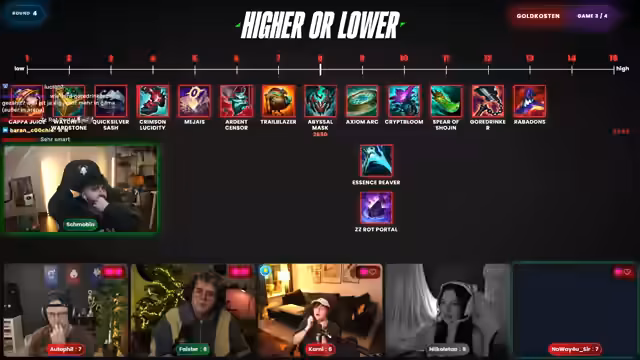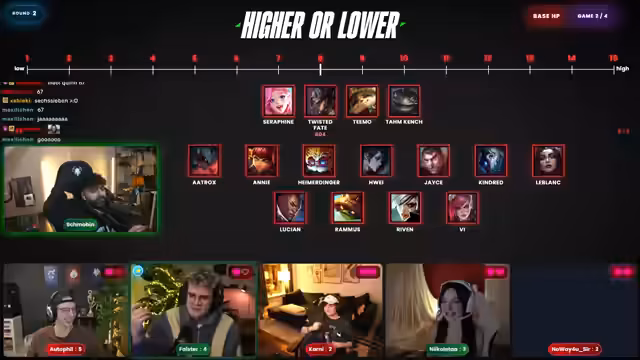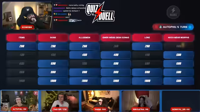 Nach einer halbstündigen Ragebait-Pause wurde der Fokus auf das Quiz gelegt. Faister erklärte das Regelsystem: In vier Kategorien sollten Champions basierend auf Skin-Anzahlen sortiert werden. Die erste Runde offenbarte Wissenslücken – selbst Amumu wurde falsch eingeschätzt. Zwischendurch gab es Pläne für post-Quiz-Aktivitäten, darunter WoW Hardcore oder Rocket League.