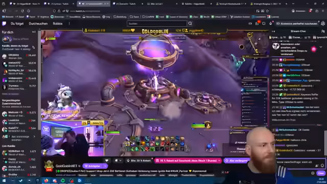 00:20:20Nach technischen Vorbereitungen beginnt die eigentliche Midnight-Session. Der Streamer ist Level 61 und in einer Boost-Gruppe, die ihn auf Level 85 bringt, während er im Hintergrund weiter gelevelt wird. Er spielt einen Druiden und beschreibt die Server als stabil. Er unterhält sich mit dem Chat, gibt Drops wie Pets für Subs weg und macht sich über seine geringe Erfahrung in Retail lustig. Er erwähnt die Gilde 'Alles ist', die Streamer-only ist und eine Verbindung zu Sauerkraut darstellt.