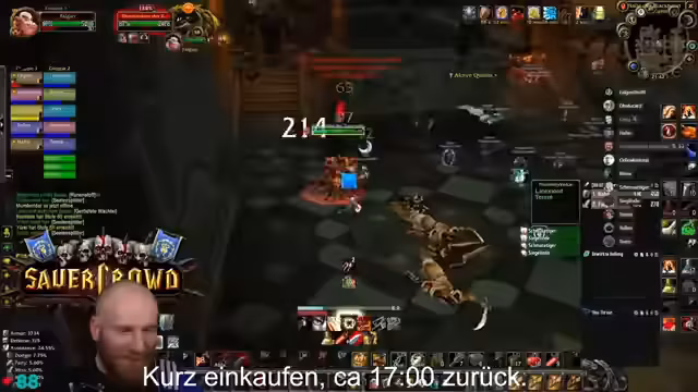 08:26:14Ein Spieler äußert seine Erschöpfung und Motivationslosigkeit, weiterzumachen, nicht zuletzt aufgrund technischer Probleme wie angeschlagener Buffs und niedrigem Mana. Die Diskussion dreht sich um den optionalen Kampf mit einem Boss, der für das Öffnen einer Tür nötig ist, aber auch solo gemeistert werden kann. Der Streamer kündigt seinen baldigen Abschied für den Tag an.
