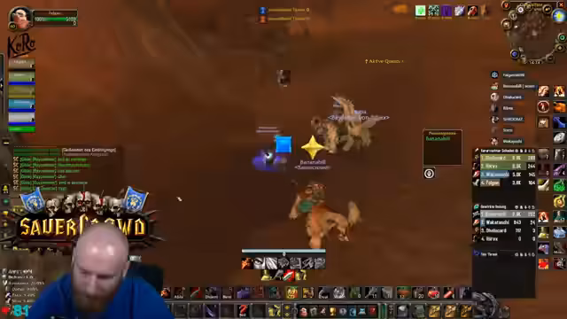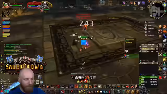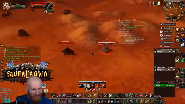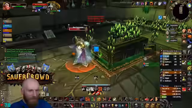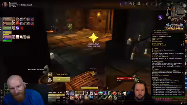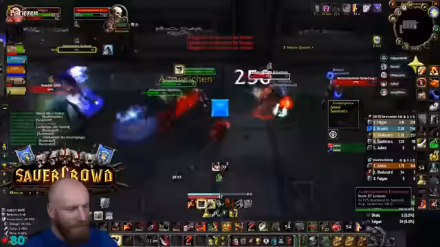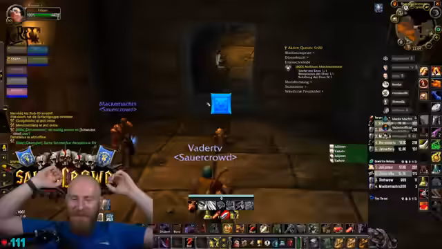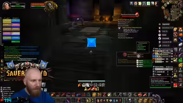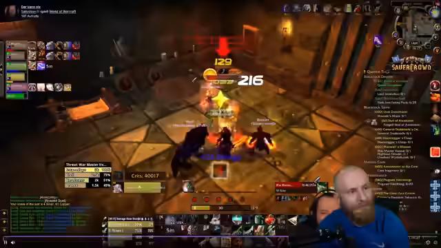 11:40:38Der Streamer konzentriert sich auf das Gameplay in Upper Blackrock Spire, während er mit dem Chat interagiert. Er gibt Anweisungen zur Orientierung im Raum warnt vor den agressiven Orks und deren Ladungen und erklärt die Pull-Strategie anhand der Markierungen. Dabei unterhält er sich auch über das Gearing und die Ausrüstung seiner Mitspieler und fordert den Chat auf, bei den Socials vorbeizuschauen.