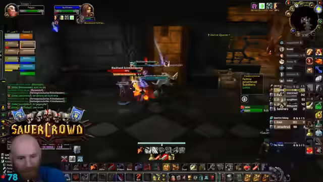 00:09:36Nach kurzem AFK-Status wird der Stream fortgesetzt und die Gruppe für den Run in Strattholm zusammengestellt. Der Streamer übernimmt die Führung und steuert die Gruppe durch die Instanz. Es werden Kampfmechaniken erklärt, wie das Aggro-Management bei Bossen und der gezielte Angriff auf Gegner. Die Herausforderungen des Runs, wie eine knappe Gesundheitssituation und ein komplexer Bosskampf, werden live kommentiert und gemeistert.