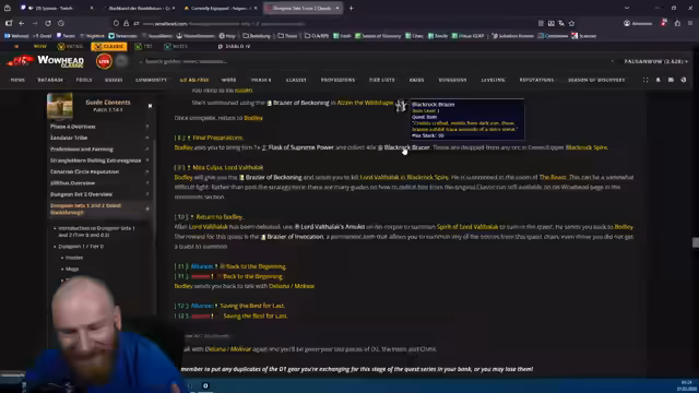 14:25:35Für den Folgetag wird ein detailreicher Plan für die T0.5 Quest-Line vorgestellt. Der Streamer erklärt den komplexen und teuren Prozess, der mehrere Schritte umfasst. Dazu gehören das Sammeln von Materialien, das Durchführen von Dungeon-Runs und das Lösen von Quests in Gebieten wie Silithus und Winterspring. Ein besonders schwieriger Teil ist der RNG-basierte Spawn von Bossen durch das Triggern von Windsteinen. Am Ende der Questline steht der_spawn von Lord Valthalak, der als einer der härtesten Bosse im Spiel außerhalb von Raids gilt.