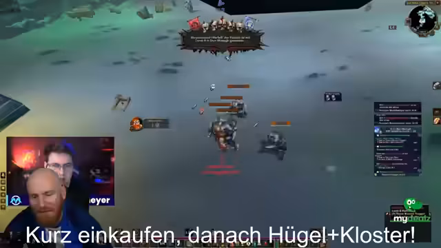 09:16:19Das Team stürmt den "Kloster"-Dungeon, trifft auf massive Gegnerhaufen ("Fatpulls") und kämpft ohne optimale Waffe oder volle Manavorräte. Trotzdem gelingen die Kämpfe durch clevere Taktik, insbesondere durch das Anlocken und Positionieren der Gegner an den Wänden, um Schaden zu minimieren.