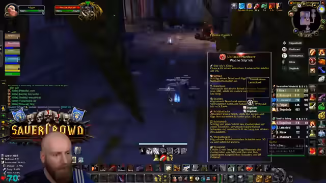 06:34:50Die Gruppe trifft auf einen der gefährlicheren Bosse im Dungeon. Der Streamer warnt den Heiler, da der Boss stark zuschlagen kann und einen Mordrestaur haben könnte. Die Strategie für den Kampf beinhaltet, den Boss zurückzuziehen, um mehr Platz zu haben, und Last Stand als Notfallmaßnahme bereitzuhalten. Es kommt zu einem kritischen Moment, als der Streamer fast stirbt, was durch einen Heilspruch verhindert wird. Er kommentiert den Kampf als anspruchsvoll aber überwindbar.