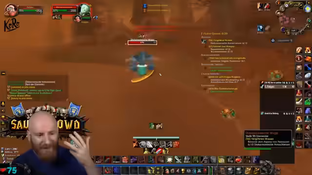 00:06:44Der Fokus verlagert sich auf das Gameplay. Gemeinsam mit einem Begleiter namens Kartoffel wird eine Quest inszeniert, bei der die Aufmerksamkeit gefordert ist. Der Streamer gibt präzise Anweisungen für den Weg durch eine gefährliche Zone mit Sauriern. Dabei wird auf den Tod eines Teammitglieds hingewiesen, das aufmerksamkeitsbedingt den Stream geöffnet und sich so in tödliche Gefahr begeben hat. Weitere Pläne umfassen das Absolvieren von Sidequests, das Sammeln von Flugpunkten und das Herstellen von Engineering-Items wie dem Goblin-Raketenhelm, wofür das Sammeln von Materialien wie Flüchtiger Rum nötig ist.