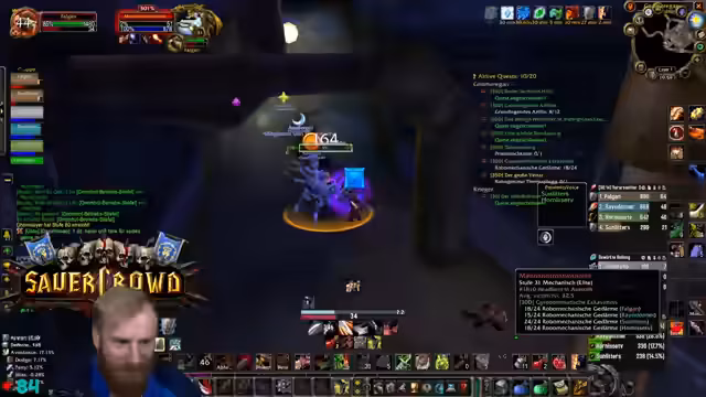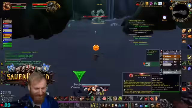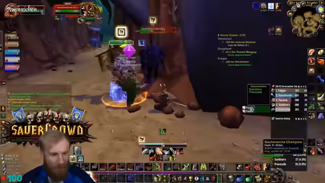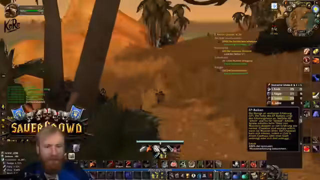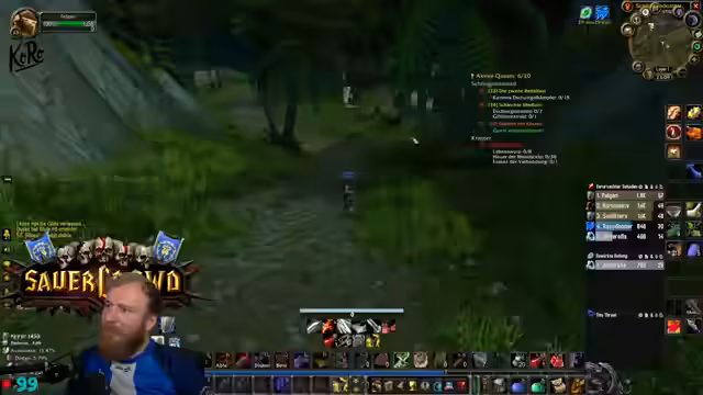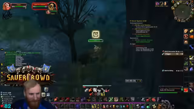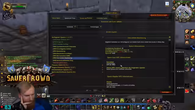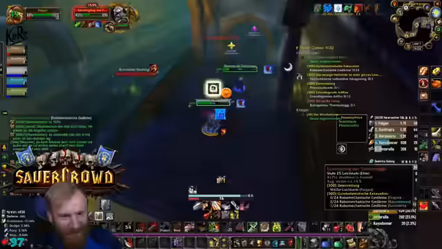 07:14:21Das Gameplay wechselt zu komplexen Quests, insbesondere einer Escort-Mission, die besondere Aufmerksamkeit erfordert. Der Streamer erklärt die Mechanik der sogenannten Blaulaubknorren-Quest im Detail, die das gleichzeitige Management von NPCs und Ressourcen erfordert. Er koordiniert die Gruppe, um die Effizienz zu maximieren und zu vermeiden, dass die Mobs überfordern. Gleichzeitig werden Looting-Strategien besprochen, bei denen seltene Items wie ein Anhänger im Fokus stehen und die Gruppe auf eine faire Verteilung achtet, was durch den Einsatz eines Roll-Systems gesichert wird.