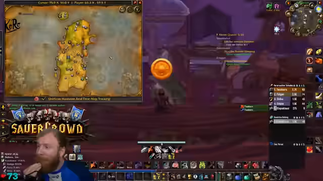 01:22:02Die Gruppe plant, sich zu verteilen und in South Shore zu treffen, um dort einen Dungeon zu beginnen. Zuvor werden noch eine Quest abgegeben und Hexenmeister-spezifische Aktionen erledigt. Ein Charakter mit dem Namen Offsi wird erwähnt, der in der Vergangenheit als Warlock-Partner diente. Es wird der Weg zum Hexenmeister-Lehrer im Magierviertel von Stormwind beschrieben und die Schwierigkeiten bei der Orientierung in der Stadt thematisiert. Der Streamer äußert eine Vorliebe für Wärme- und Kälteschaden und sucht nach effektiven Farm-Methoden für Gegner in Loch Modan.