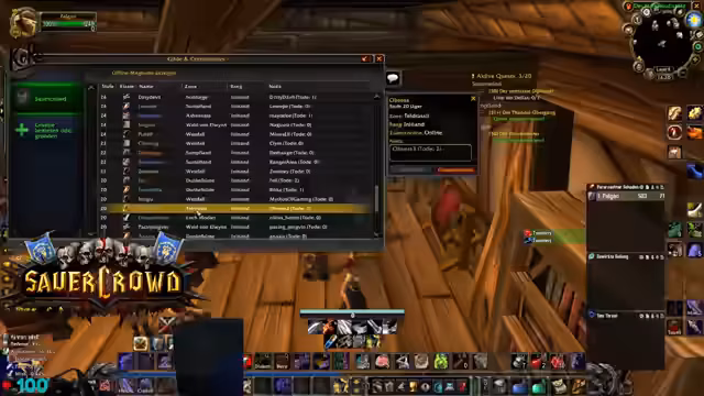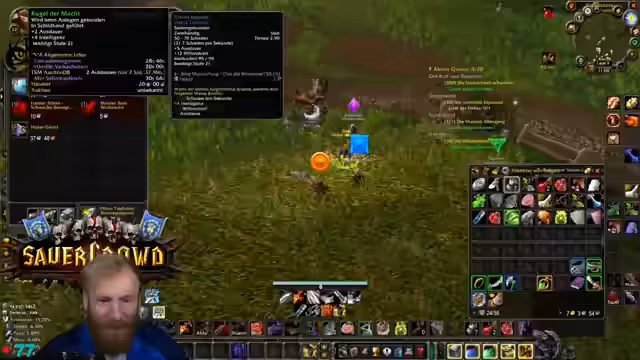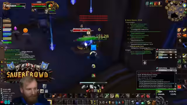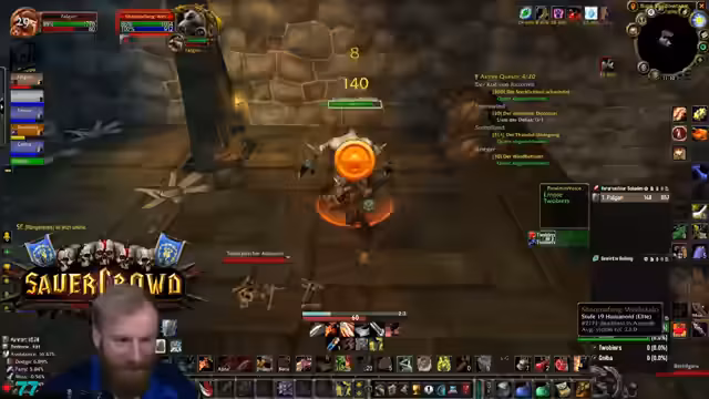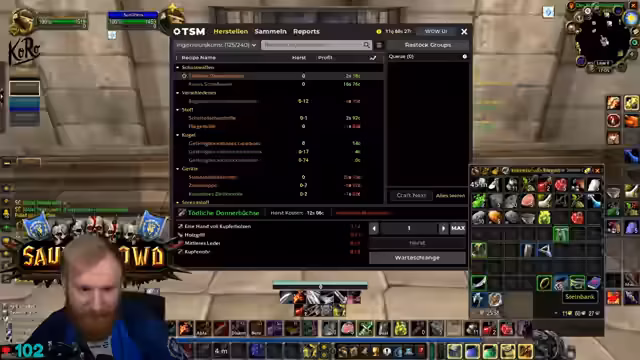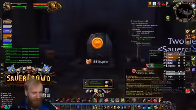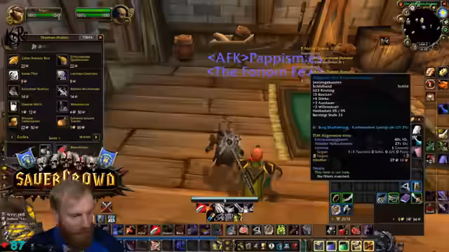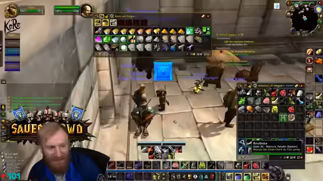 05:16:11Der Streamer bereitet sich darauf vor, eine Quest in der Taverne 'Zum Lamm' in Sturmwind abzugeben, wobei er sich in der Stadt etwas verirrt. Gleichzeitig werden die Vorbereitungen für den Dungeon Razorfen Downs getroffen. Es werden Items wie Silberruten, Blau-Knollen und Rezepte besprochen, die für den Dungeon benötigt werden. Die Gruppe ist fast vollständig und der Start des Dungeons steht bevor.