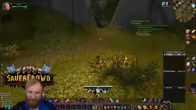 07:02:12Beim Vormarsch durch das Brachland vor den Todesminen wird die Gruppe mit Elite-Mobs konfrontiert, was den Streamer sehr verunsichert. Es wird auf einen speziellen Cursed Mob hingewiesen, der bei Ablauf seines Fluchs massiven Schaden verursacht. Der Streamer betont die Notwendigkeit, aufeinander aufzupassen, und äußert Bedenken hinsichtlich der Sicherheit der Gruppe, insbesondere als sie zu dritt durch eine gefährliche Höhle ziehen.