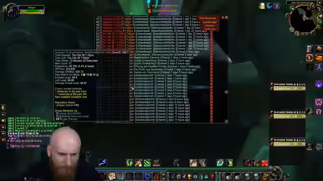 08:49:35Das langfristige Ziel ist, den Druiden auf Level 65 zu bringen, um ihn in die 'Schattenlobby' für den Endgame-Inhalt zu transferieren. Dies stellt eine Herausforderung dar, da das derzeitige Equipment des Druiden sehr schlecht ist. Der Streamer stellt klar, dass er den Char nicht hauptsächlich leveln will, sondern den Inhalt von Midnight erleben und gleichzeitig den Druiden im Hintergrund boosten lassen möchte. Parallel dazu wird der Beginn eines Karate-Events am Abend erwähnt.