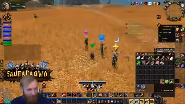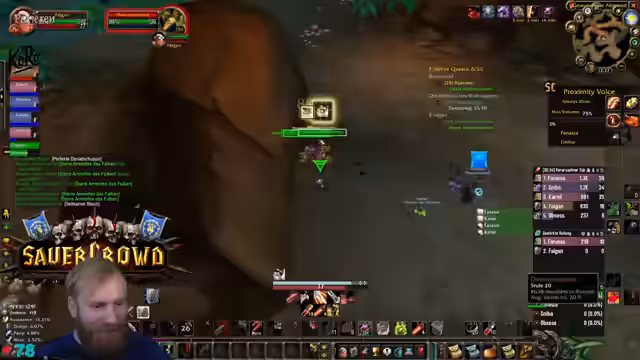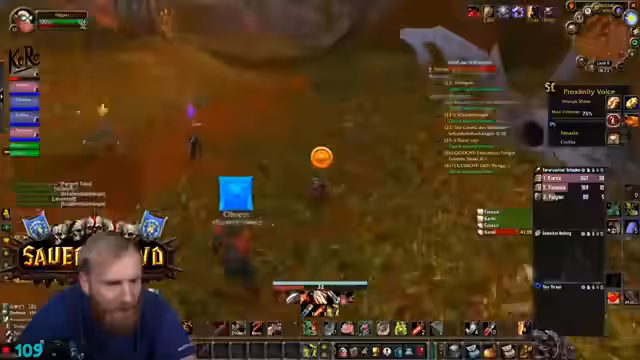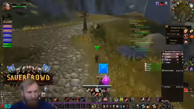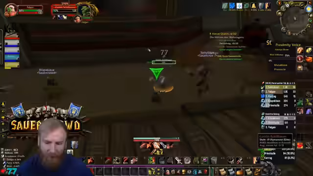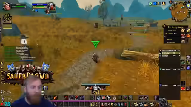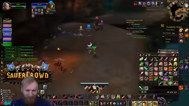 05:25:24Die Gruppe ist auf der Suche nach spezifischem Material für eine Paladin-Quest. Dabei zeigt sich, dass die automatische Loot-Verteilung (FFA) zu Verwirrung führt, da nicht alle Spieler alles looten können, wenn Taschen voll sind. Der Streamer entscheidet, den Raptor mit einem Ogremob zu farmen, während er auch über fehlende Skills wie den Buff eines Priests spricht, was er aufgrund seines Addons nicht aktivieren kann.