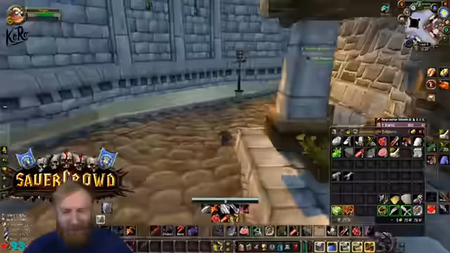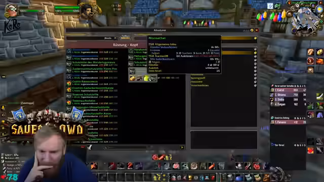 02:18:51Der Streamer kämpft mit einem überfüllten Inventar und überlegt, Ressourcen wie Leder und Kräuter effizienter zu verwalten. Ein Kräuterbeutel wird als Spielveränderung bezeichnet und als sinnvoll für viel Sammler angesehen. Gleichzeitig plant er, Crafting-Items wie die Ingenieursbrille herzustellen und fragt daher nach benötigten Rohstoffen wie mittlerem Leder im Gildenchat, um seine Berufe zu leveln.