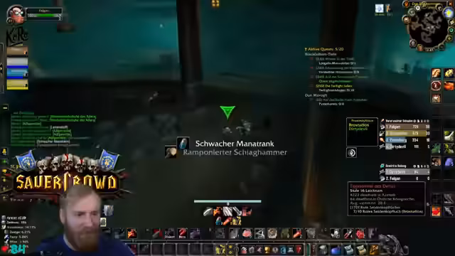 02:05:34Beim Sammeln der Questgegenstände stoßen die Spieler auf Loot, der für einen Schurken ideal ist. Es kommt zu einer Diskussion, ob ein Priester einen Gegenstand mit Ausdauer für Willenskraft statt eines reinen Ausdauer-Gegenstandes tragen sollte, da der Mana-Regeneration der Willenskraft vorgezogen wird. Dies unterstreicht das rollenspezifische Denken und die Koordination innerhalb der Gruppe.