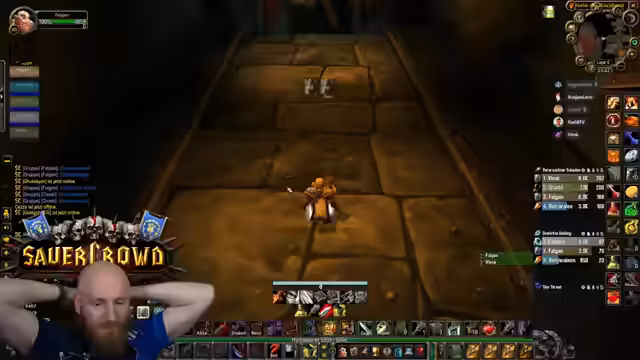 11:55:59Der Streamer gibt zu, den Endboss von BRD noch nie gemacht zu haben, nur den Raum kennt er. Es gibt eine Geschichte, in der ein Streamer namens Rubbi in diesem Raum seinen Mage verloren hat. Ein 'trickshot pull' wird als notwendig erklärt, um mehr Platz zu gewinnen. Bei einem Kampf werden plötzlich Mobs von einem Balkon nach unten gezogen und gefährden die Gruppe.
