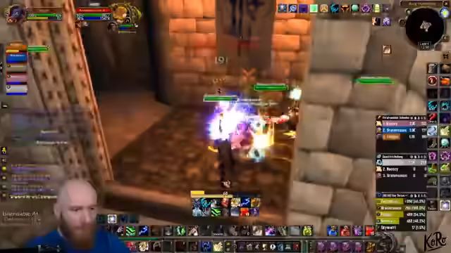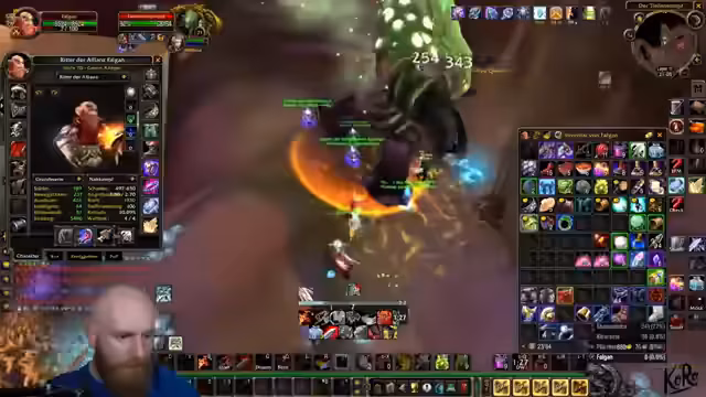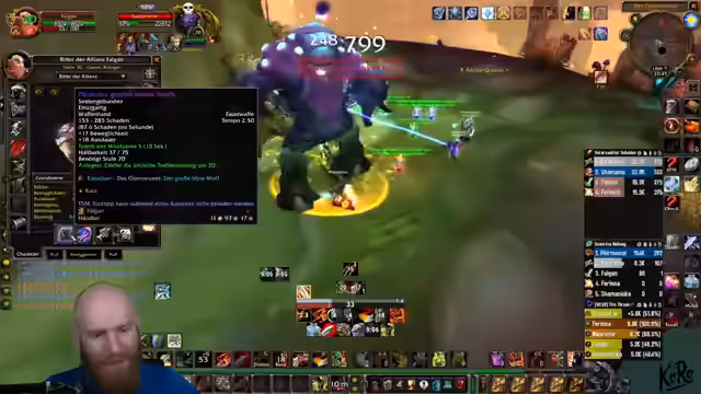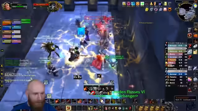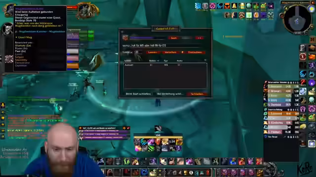06:12:26Der Streamer startet den Karazhan-Raid und stellt die Gruppe zusammen. Er ist auf der Suche nach einer Melee-Flasche und bekommt aus dem Chat wertvolle Hinweise. Der erste Boss, Moroes, wird schnell getötet, und es Drops eine relevante Schulter, die der Streamer für seinen Krieger behält. Er kommentiert den Schaden und den Verlauf positiv.