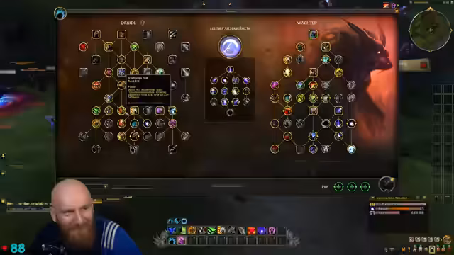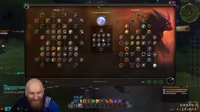 07:48:42Die Pause wird genutzt, um sich intensiv mit dem Talentbaum des Guardian Druiden auseinanderzusetzen. Der Streamer liest die Beschreibungen der Fähigkeiten durch und ist von den synergistischen Effekten beeindruckt, insbesondere von den Selbst- und Gruppenheilungsmechaniken wie 'Traumbrücken' und der automatischen 'Rasenden Regeneration'. Die Diskussionen im Chat und mit Sirenia helfen ihm, die komplexen Talente zu verstehen und eine Build auszuwählen.