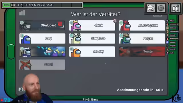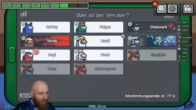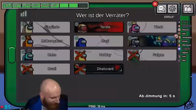12:17:09Ein Mitspieler wurde ins Visier genommen, weil er bestimmte Aufgaben nicht erledigte, was ihn verdächtig machte. Der Streamer analysierte das Verhalten der Spieler und kam zu dem Schluss, dass ein spezielles Muster bei den Tötungen existieren könnte. Es wurde ein Treffen einberufen, um über die nächsten Schritte abzustimmen und das Votings zu koordinieren.
