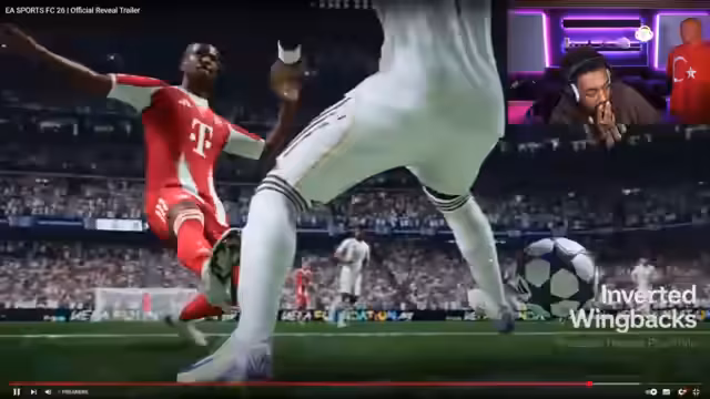 00:10:07Nachdem der Trailer erschienen ist, werden die ersten Eindrücke geteilt. EA hat laut Streamer den Fokus stark auf Gameplay gelegt, was nach den Problemen des Vorjahres als positives Zeichen gewertet wird. Es wird gezeigt, wie Tackles verbessert und unkontrollierte Abpraller (Bouncebacks) behoben werden. Die Bewegungen und das Dribbling der Spieler, hierbei exemplarisch an Musiala, wirken flüssiger und schneller.